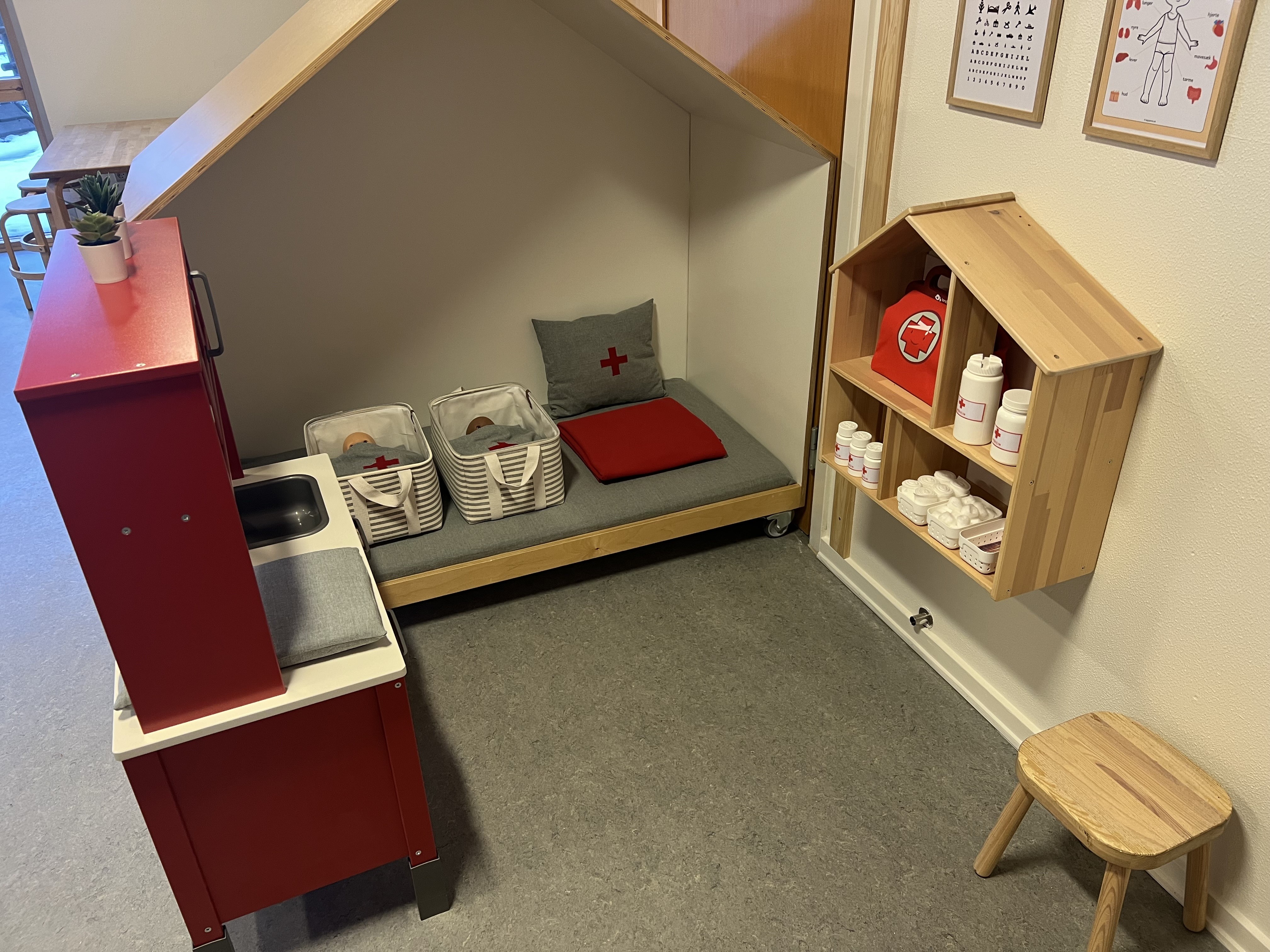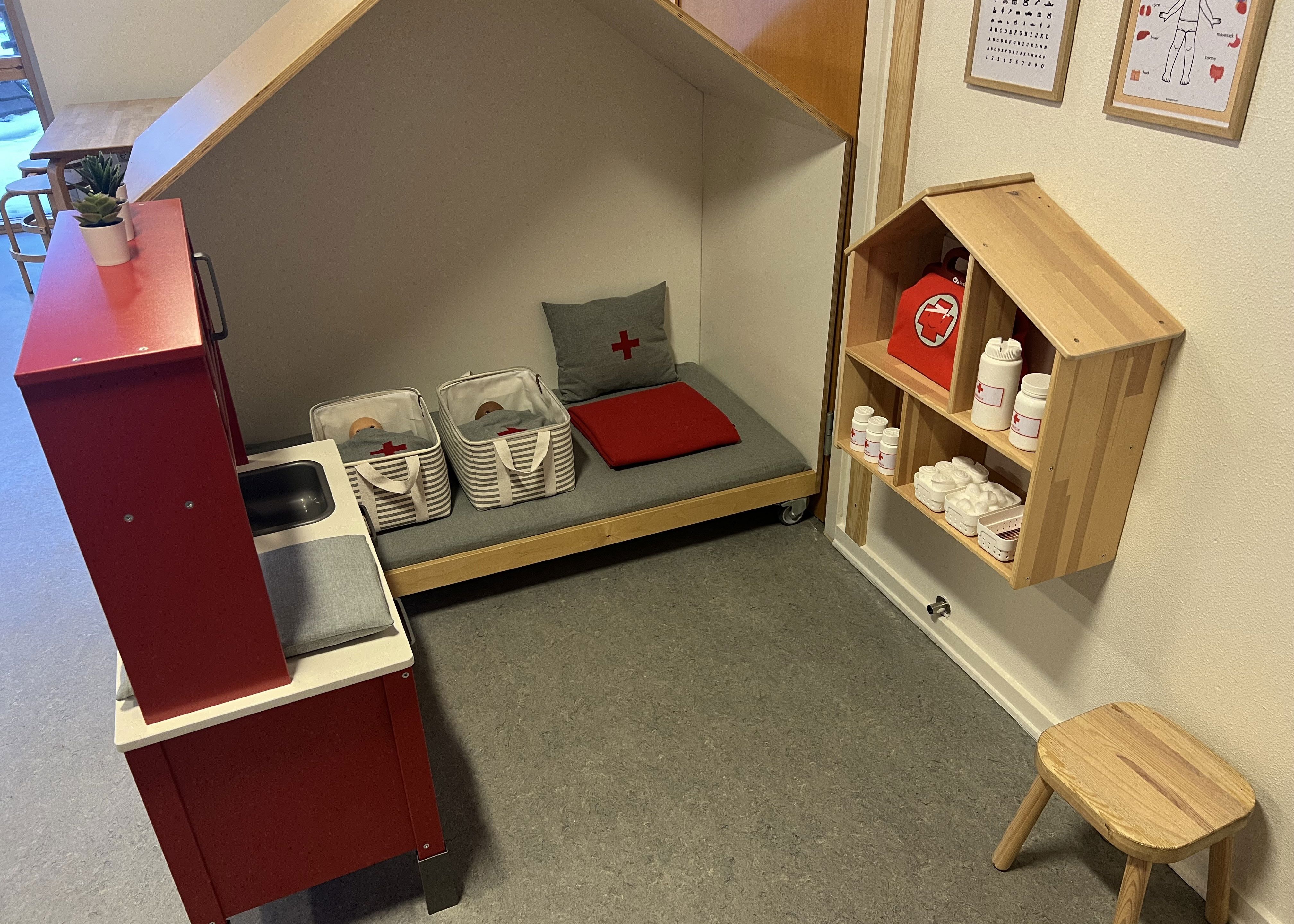 - Børnenes kasse i garderoben fyldes med 2-3 sæt skiftetøj, som er tilpasset årstiden. Overtøj og sko har plads i garderoben. Forældrene har ansvaret for, at det er klart til næste dags brug.